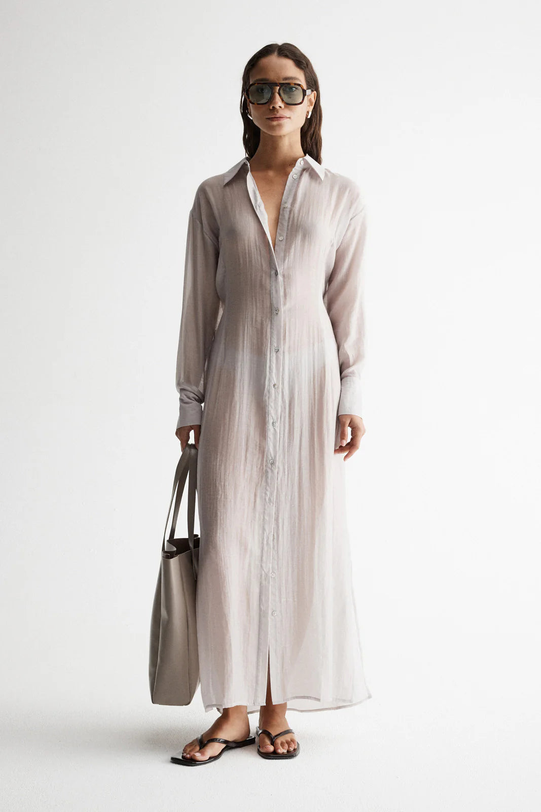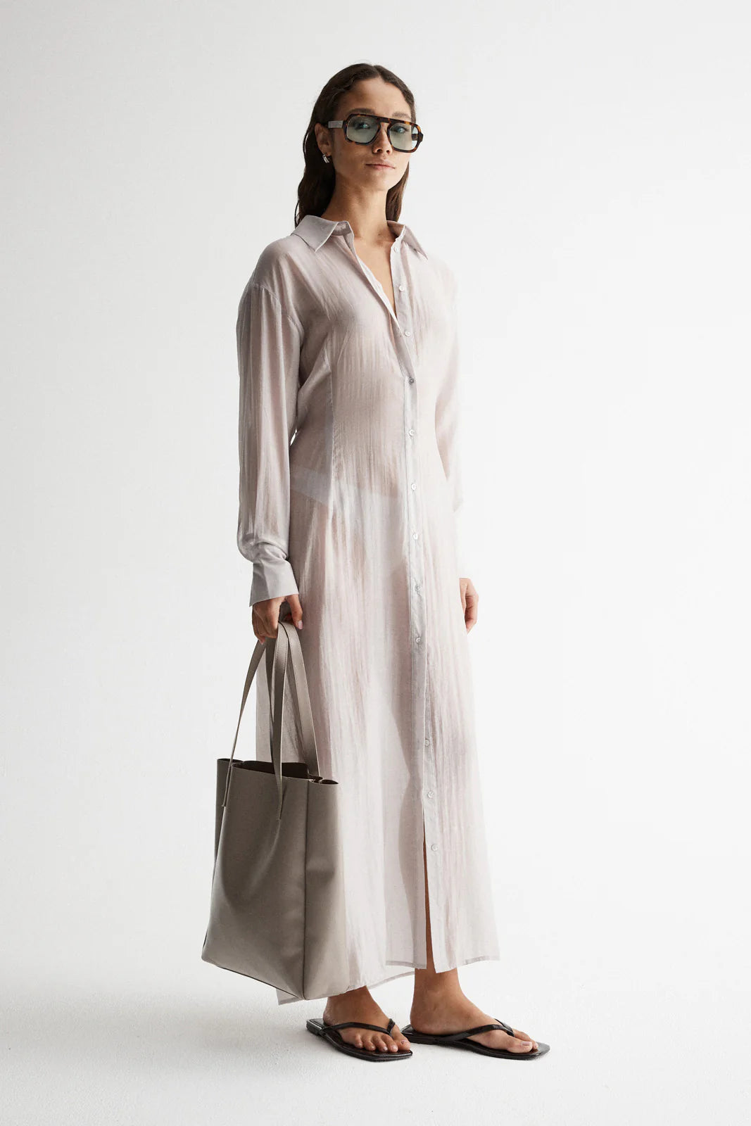 Combining tailored detailing with relaxed resortwear, the new season brings effortless outfitting with our signature sensibilities. The Bodhi Shirt Dress is made of a lightweight semi-sheer fabric with a soft, textured feel. A maxi length style with collared neckline, button through front, and full length sleeve, this dress features an adjustable corset tie at the back. Style over swimwear.