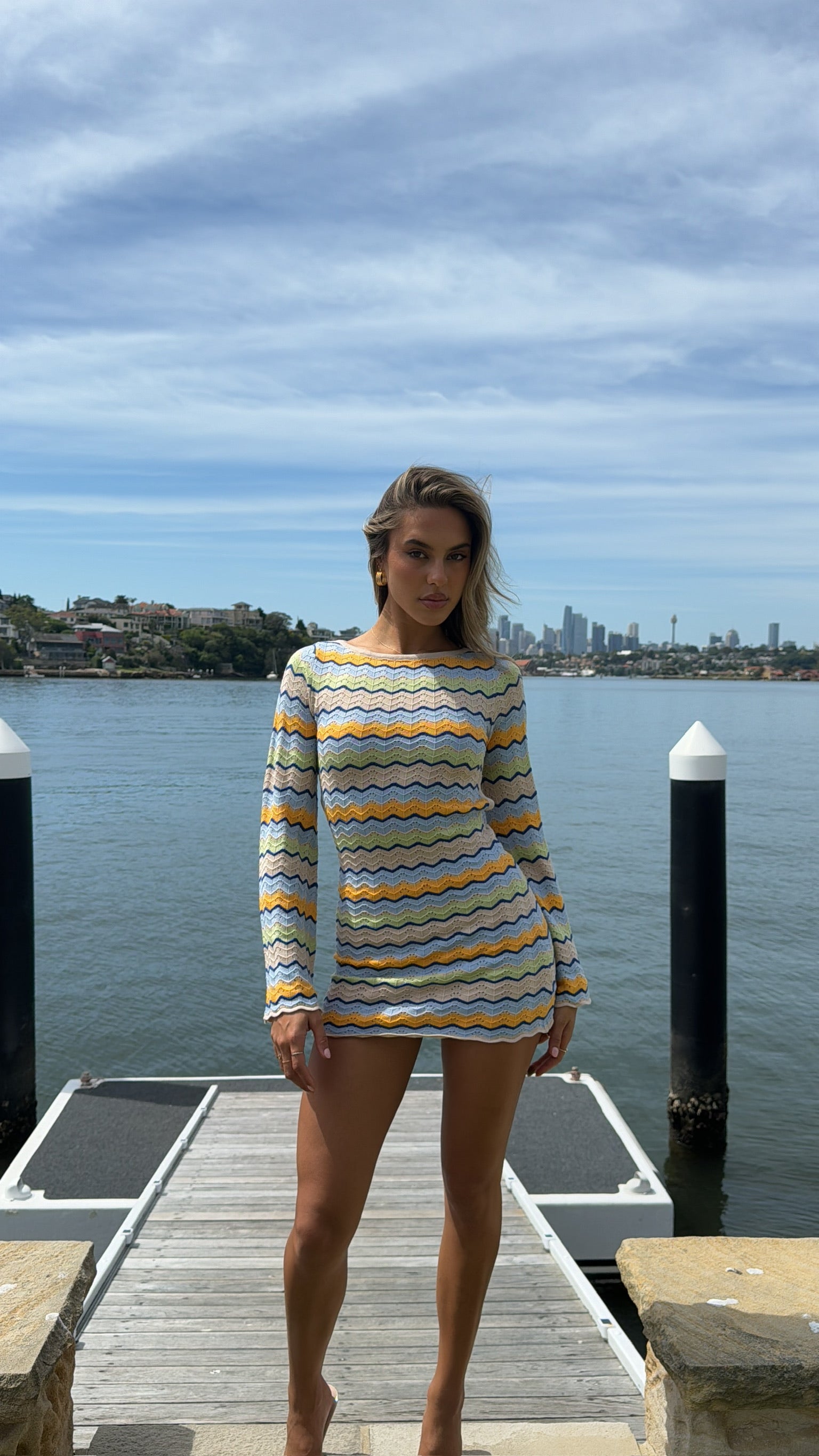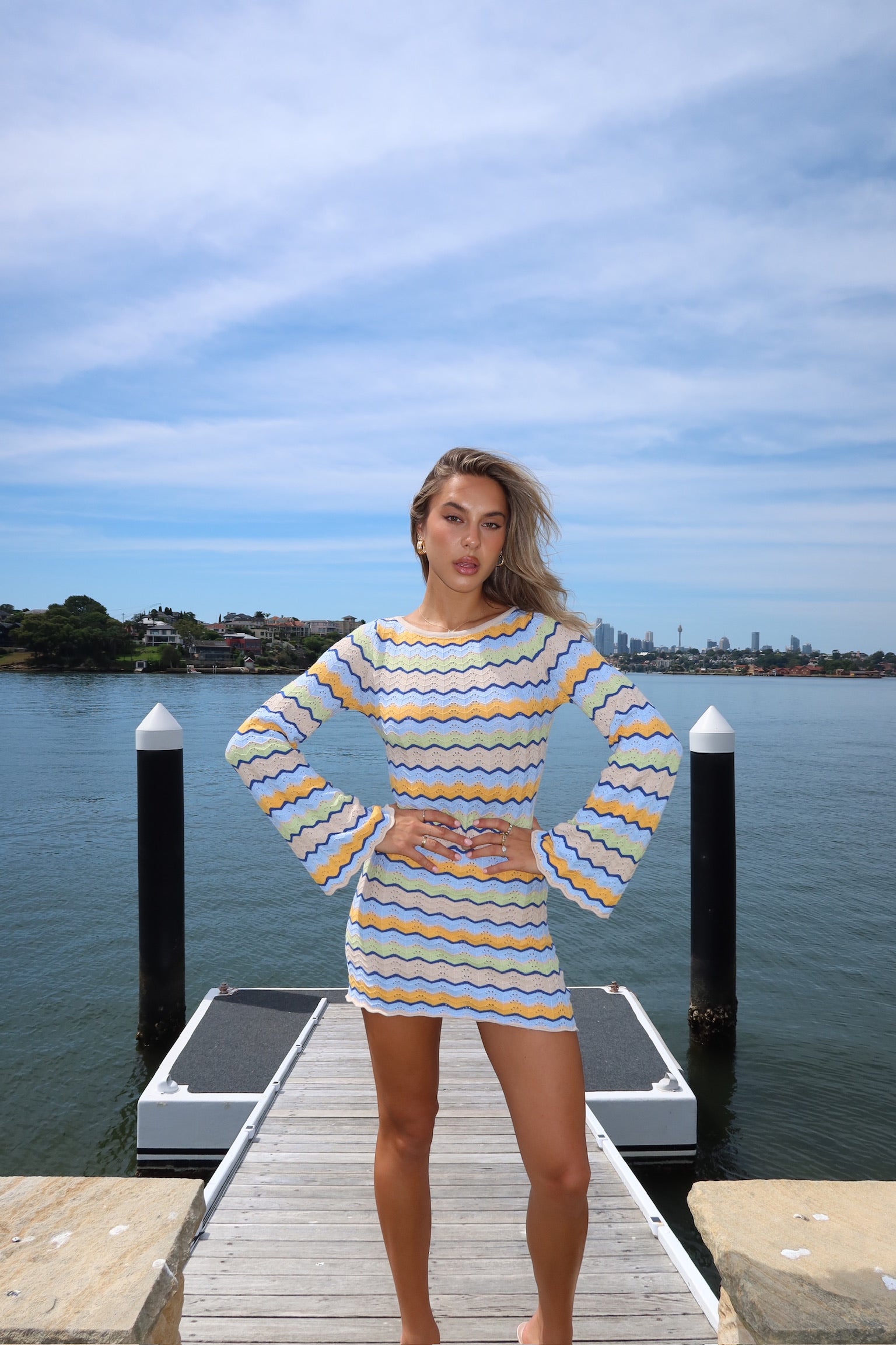 Our Isabo Mini Dress features long bell sleeves and an open back, taking you from beach to bar.