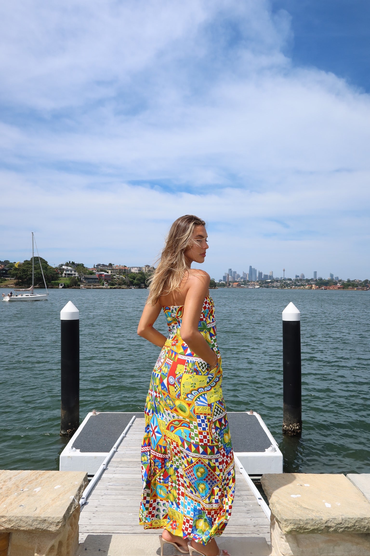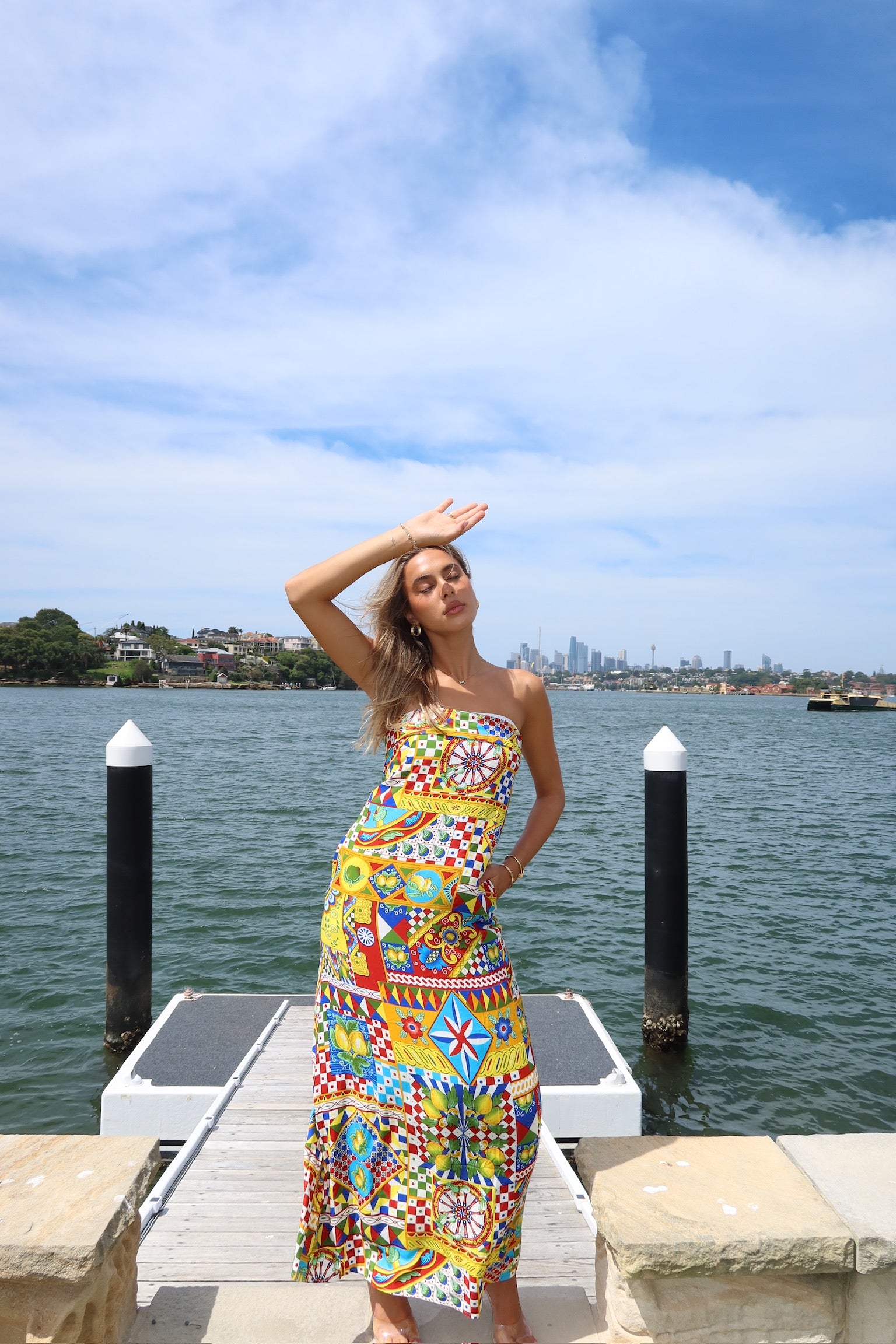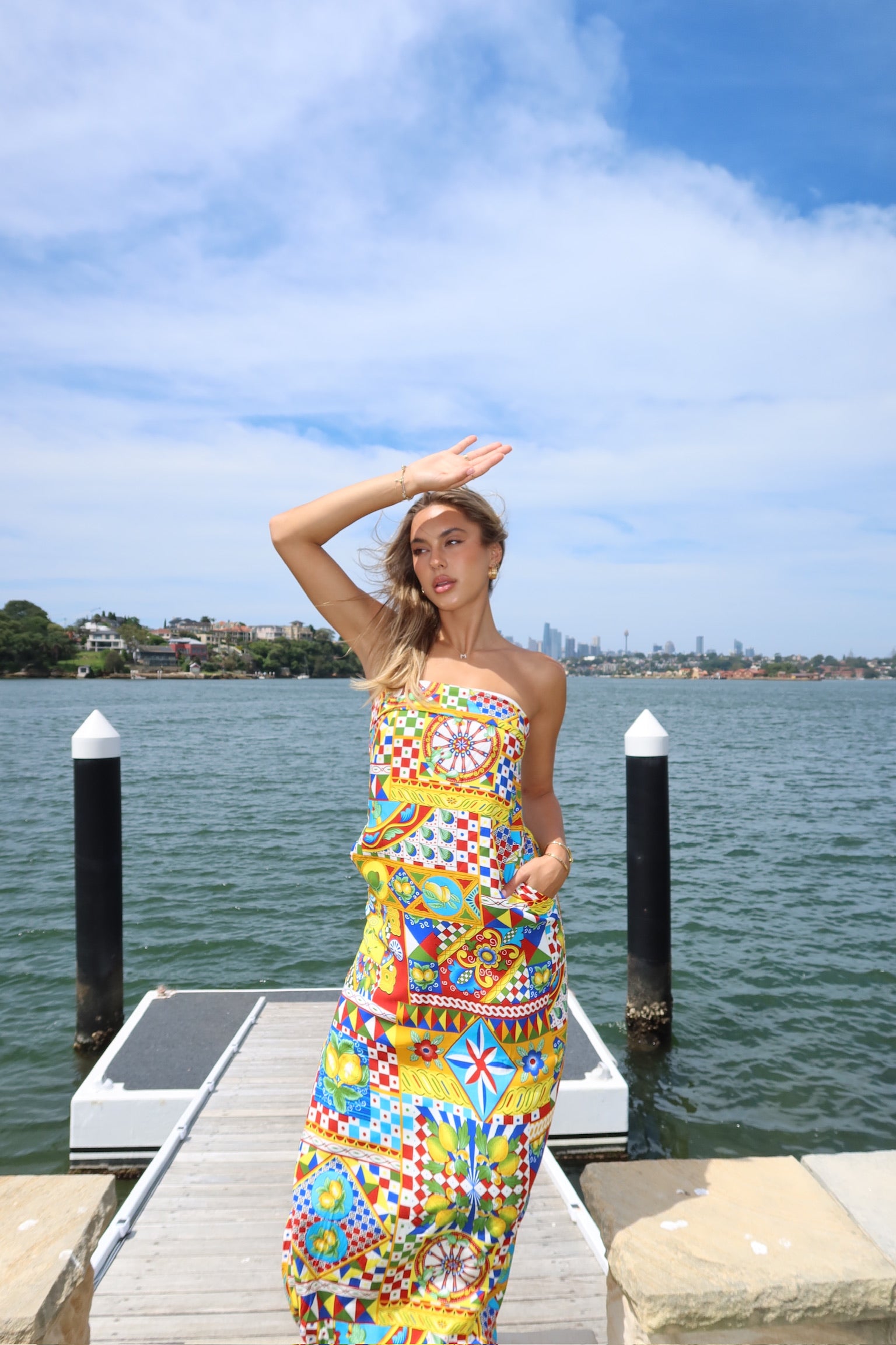 With a folded strapless neckline and stunning bold print the Phaedra Maxi Dress will have you looking effortlessly chic all summer.