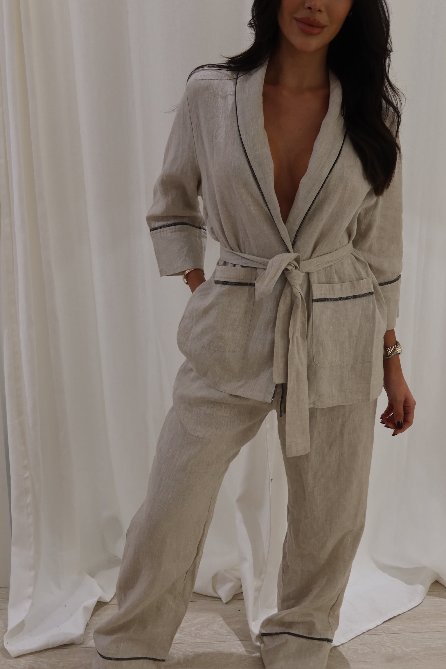 Introducing the Shoray Linen Wrap Top, designed expertly with a matching belt and convenient front pockets. Made with quality linen fabric, our top provides both style and functionality, making it the perfect addition to any wardrobe. Professional and practical, this top is a must-have for any fashion-forward individual.