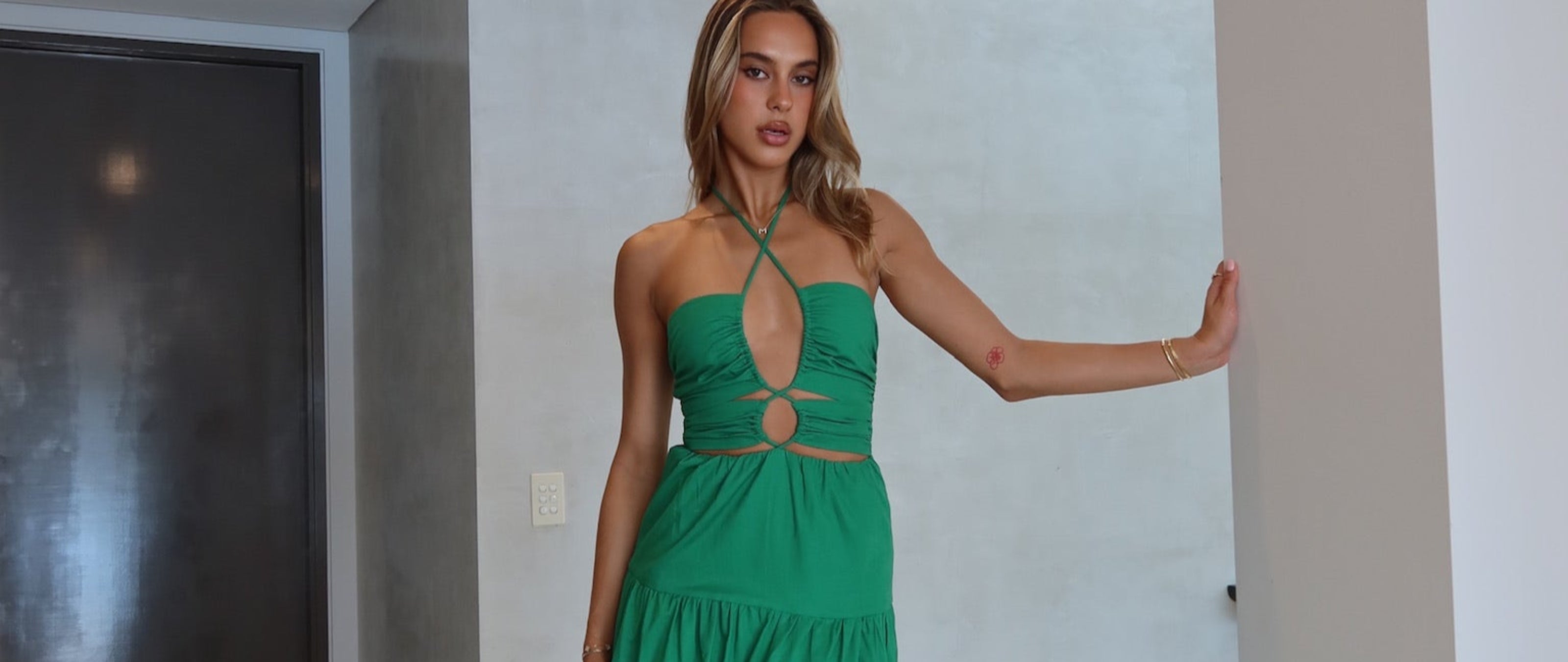 In a stunning emerald green, our Alysia Maxi Dress features cut outs and a halter neck tie up detail, perfect for your next girls lunch.