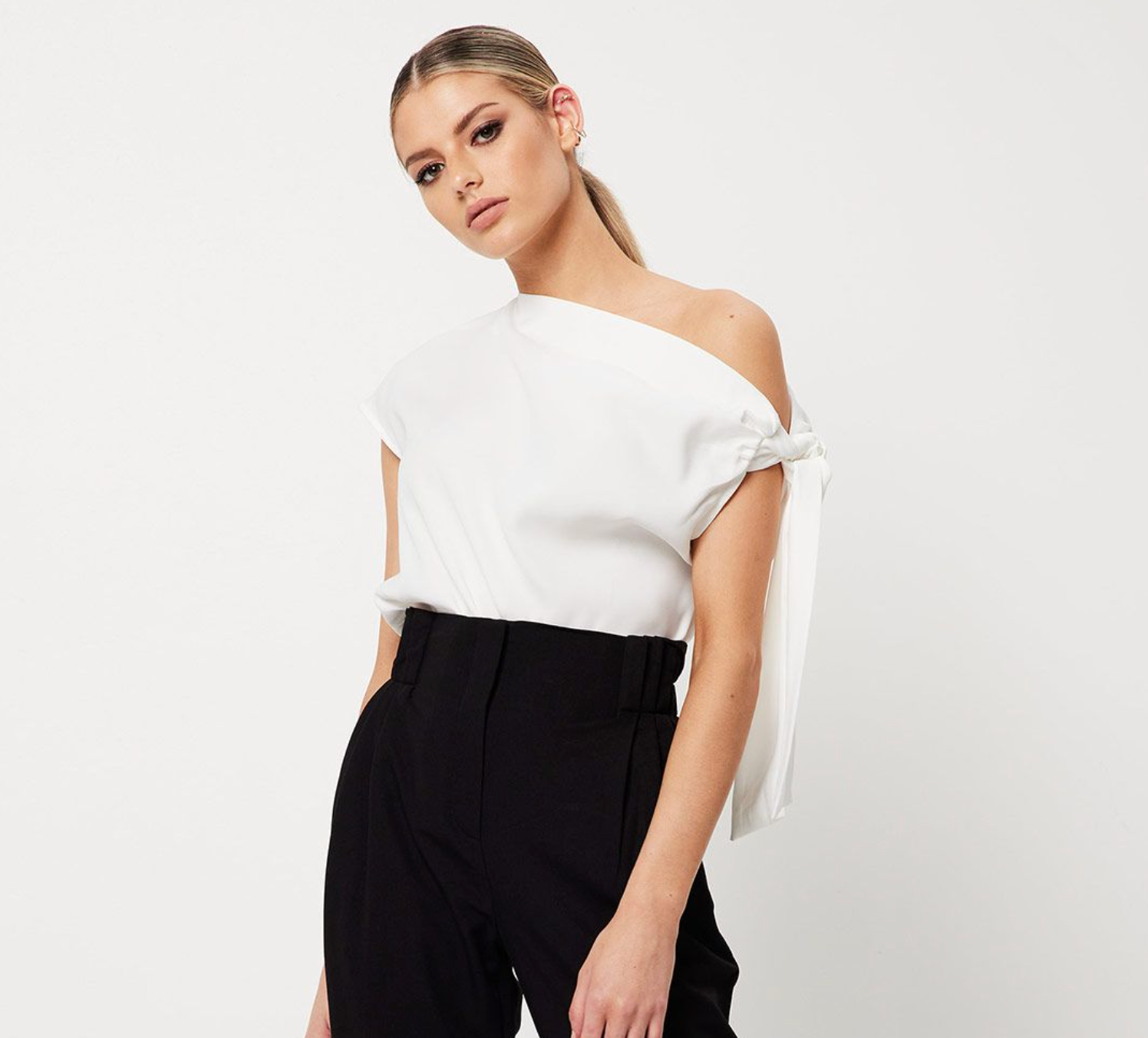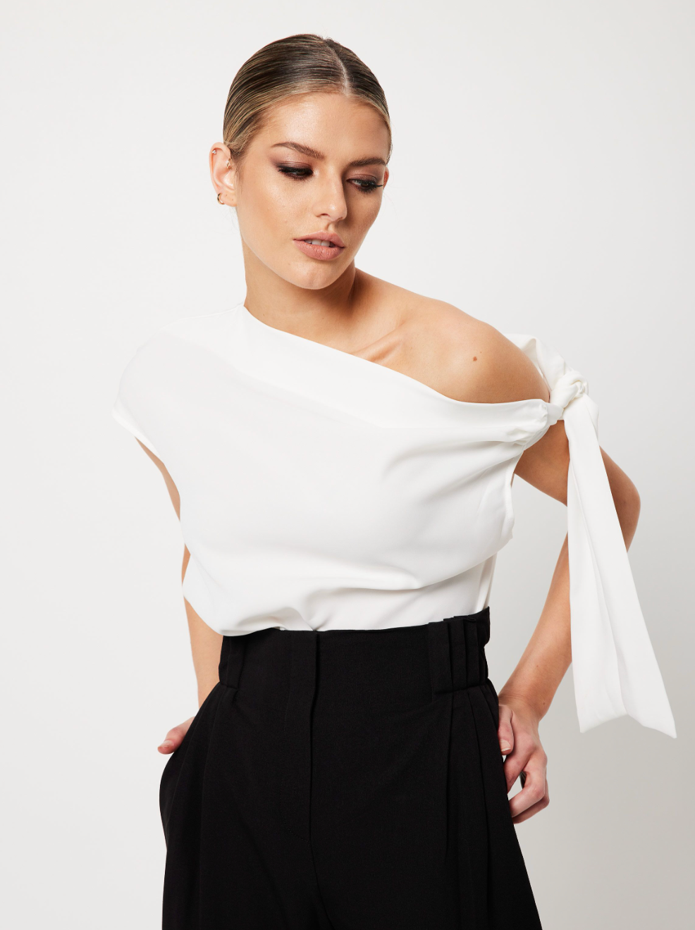 Imbued with a modern, minimalist appeal, The Drop Off Top is a sophisticated staple piece designed to take you from desk-to-dinner. In a classic shade of white, this design features an asymmetric neckline with a unique shoulder tie. This relaxed fit blouse delivers a fresh perspective for the modern woman.